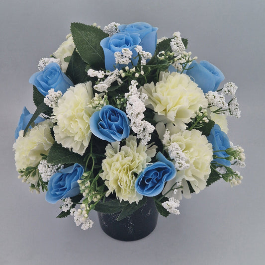 Artificial Silk Flower Arrangement Carnations and Roses Grave Pot. Memorial Tribute