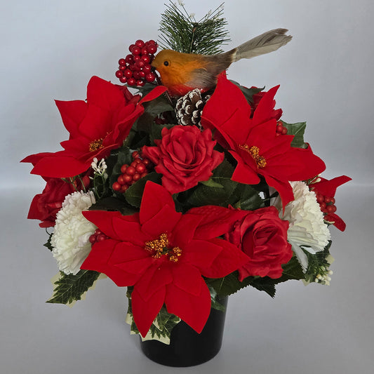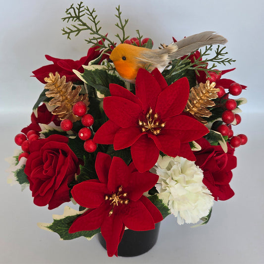 Christmas Grave Memorial Pot With Artificial Red Poinsettia and Rose with Robin