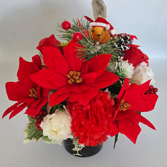 Christmas Grave Memorial Pot With Artificial Red Poinsettia and Rose Robin with a Hat