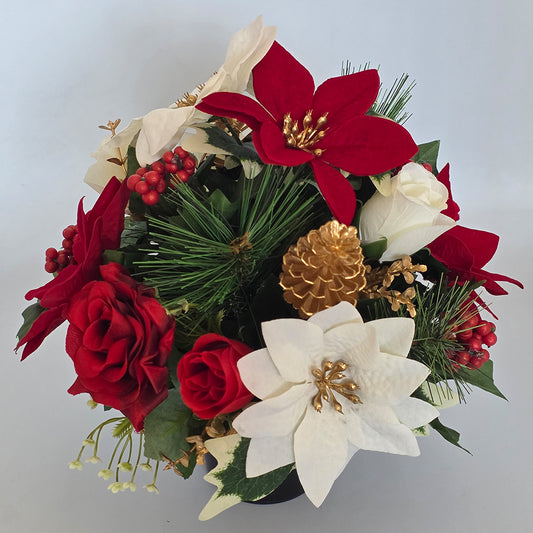 Christmas Grave Memorial Pot With Artificial Poinsettias Rose and Fern