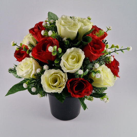 Artificial Silk Flower Arrangement Red And Ivory Crinkle Rose Bud Mix Grave Pot. Memorial Tribute