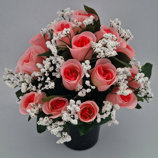 Beautiful Rose Bud & Gypsophila Arrangement Artificial Flower Pot for Grave in Pink