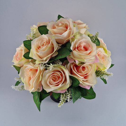 Artificial Silk Flower Arrangement Peach Open Rose Grave Pot. Memorial Tribute
