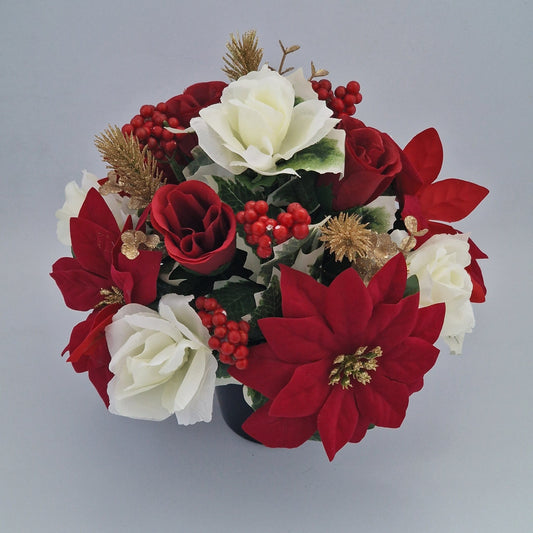 Christmas Grave Memorial Pot Arrangement With Poinsettias & Roses & Berry